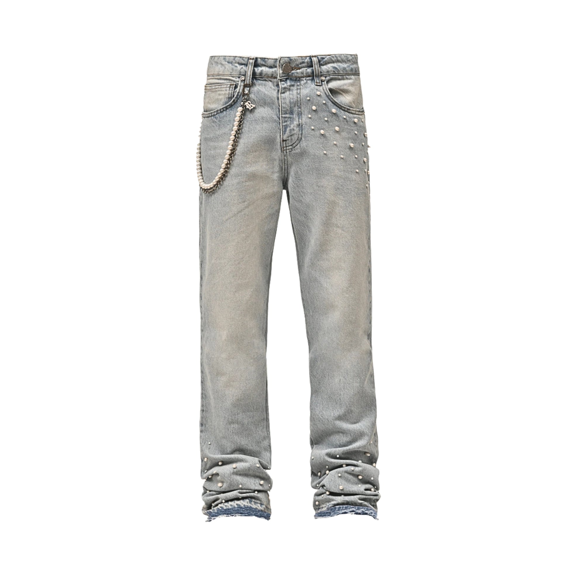 These washed jeans come with pearl-style studs and a metal chain detail on the side. They’ve got an edgy look but stay clean enough to style with anything. A solid piece if you want denim that feels a little different.